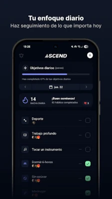 Ascend es tu socio esencial para el crecimiento personal. Sigue tus hábitos, crea rutinas poderosas y sostenibles, y alcanza tus metas diarias con facilidad. Con Ascend, transformarás tu vida un hábito a la vez.