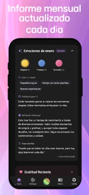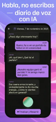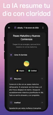 Sumérgete en un viaje de descubrimiento emocional con Reflecta. Su calendario interactivo te ofrece una perspectiva visual de tus estados de ánimo a lo largo del tiempo, revelando patrones y desencadenantes que impulsan tu crecimiento personal. Ya sea que busques fomentar la gratitud, impulsar tu desarrollo o simplemente registrar tus chequeos diarios, Reflecta se adapta a tus necesidades con diversos modos y resúmenes inteligentes que sintetizan tus sesiones en palabras clave y objetivos. Para los que valoran la privacidad, tus grabaciones se procesan al instante, sin ser almacenadas, garantizando un espacio seguro para tu pensamiento.