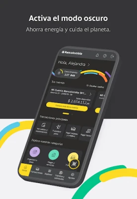 Mi Bancolombia es tu banco digital completo en una sola app. Transfiere dinero gratis entre cuentas, paga facturas y ahorra para tus metas fácilmente. Solicita tarjetas de crédito, abre cuentas y personaliza tu experiencia. Cuida el planeta con el modo oscuro mientras gestionas tus finanzas sin esfuerzo.