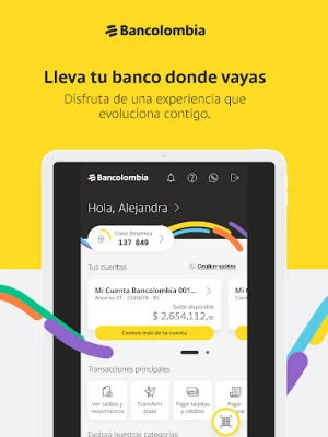 Gestiona tu dinero con una agilidad sin precedentes. Con Mi Bancolombia, enviar y recibir fondos entre cuentas Bancolombia y Nequi es una experiencia instantánea y sin costos. Tu capital se mueve al ritmo de tu vida, llegando al destino en el momento justo. Esta aplicación concentra un universo de posibilidades financieras, simplificando cada interacción para que navegar, transferir y realizar pagos sea intuitivo y eficiente, reuniendo todo lo que necesitas en un solo lugar.